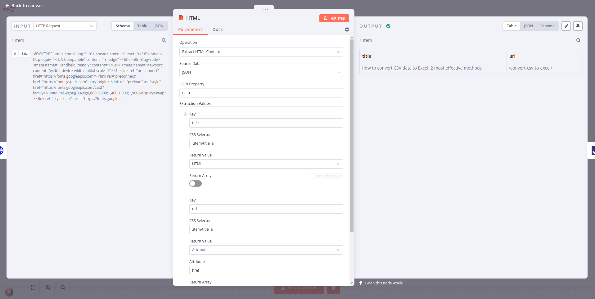 https://blog.n8n.io/(this endpoint requires no authentication). - Connect an HTML node and configure it to extract the title of the first blog post on the page.