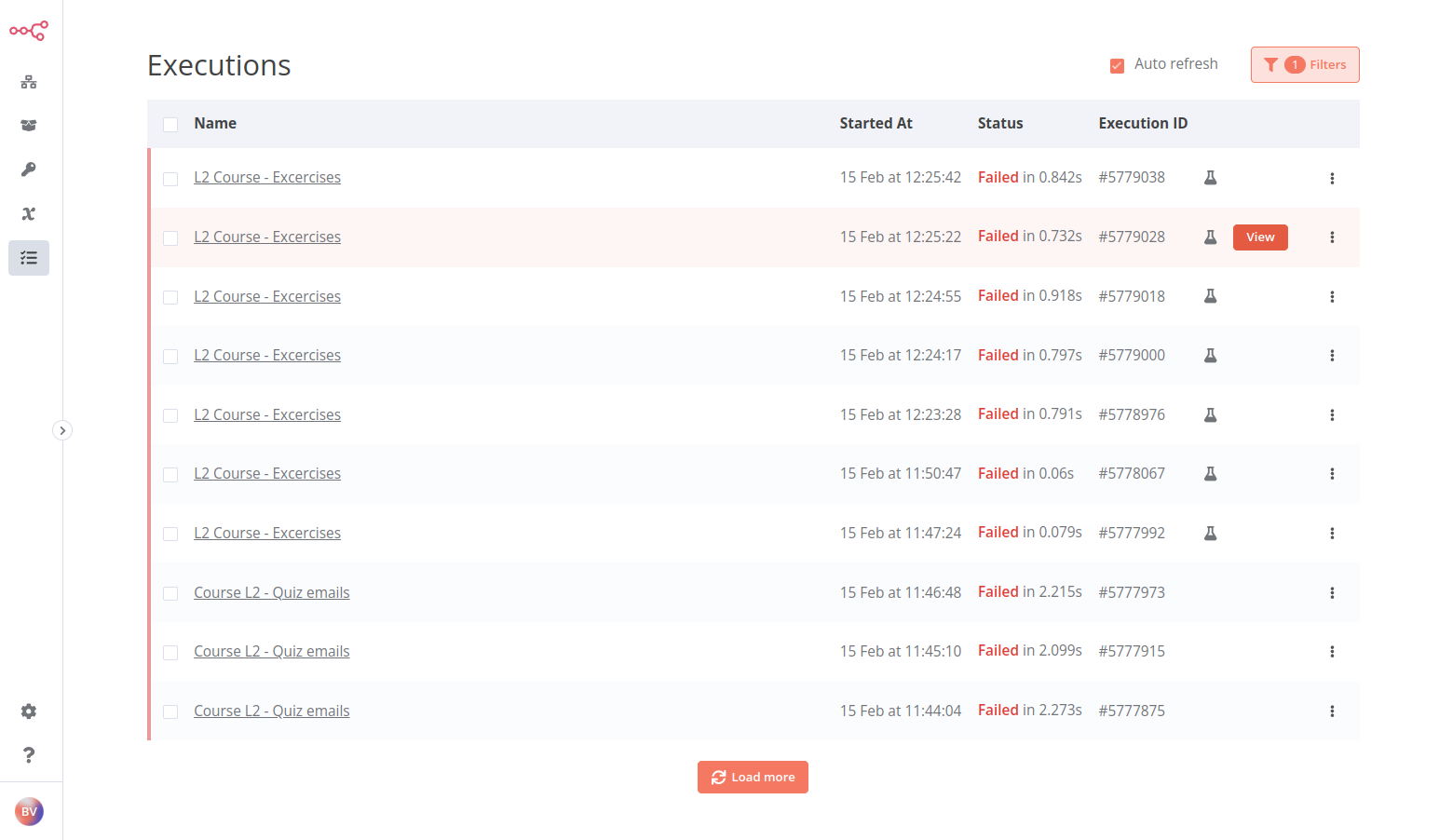 When one of your workflows fails, you can check the Executions log to see what went wrong. The Executions log shows you a list of the latest execution time, status, mode, and running time of your saved workflows.